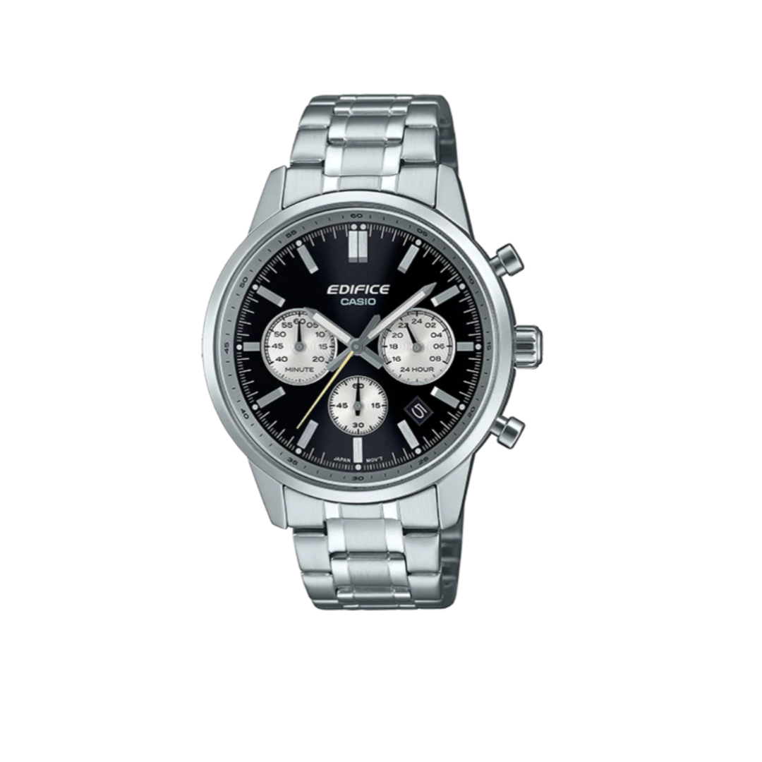 - Indicación de la hora normal: Analógica: 3 manecillas (hora, minutos y segundos), 3 diales (24 horas, minutos del cronómetro y segundos del cronómetro) Visualización de fecha